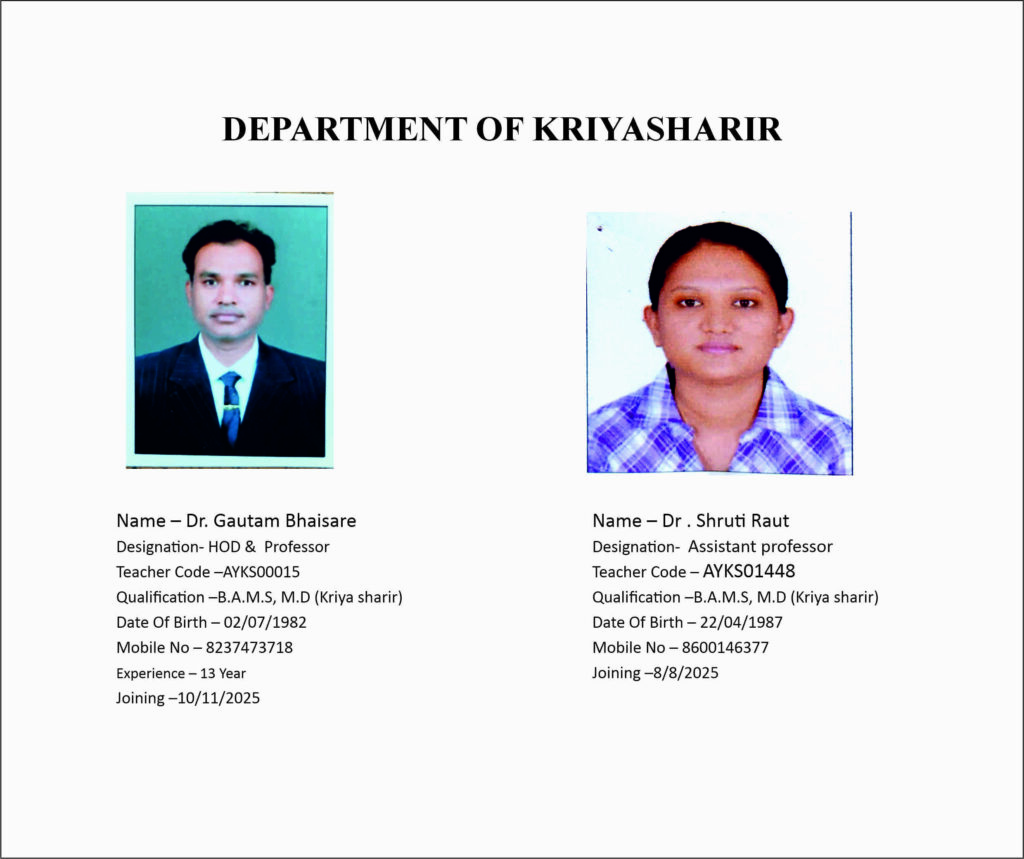 To become a center of excellence in teaching, learning, and research of Ayurvedic physiology (Kriya Sharir) by preserving classical Ayurvedic principles and integrating them with contemporary biomedical science for holistic healthcare education.
